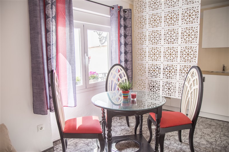 Salón con sofá, mesa y sillas, televisión y wifi.