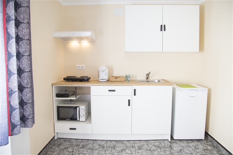 Cocina con utensilios microondas, tostador, nevera congelador y cafetera Tassimo.