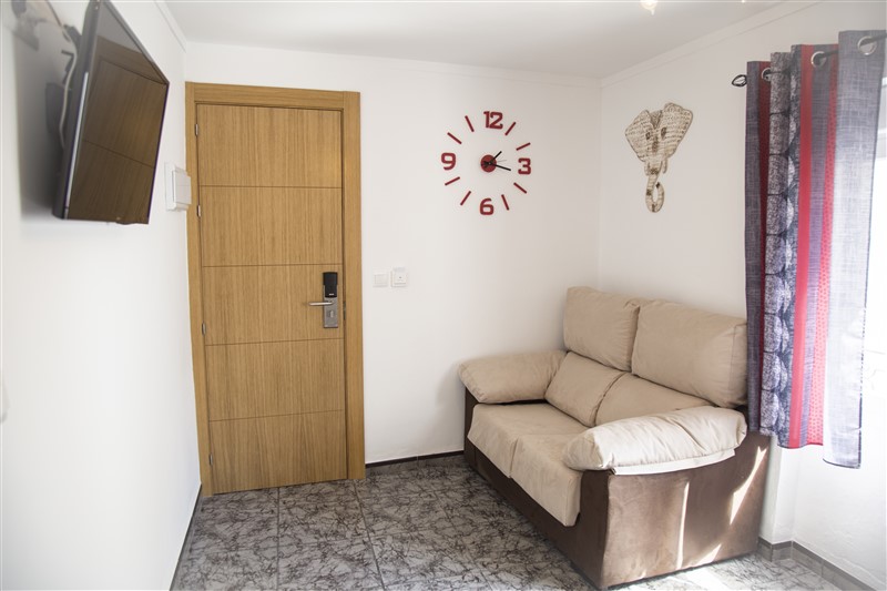 Salón con sofá, mesa y sillas, televisión y wifi.